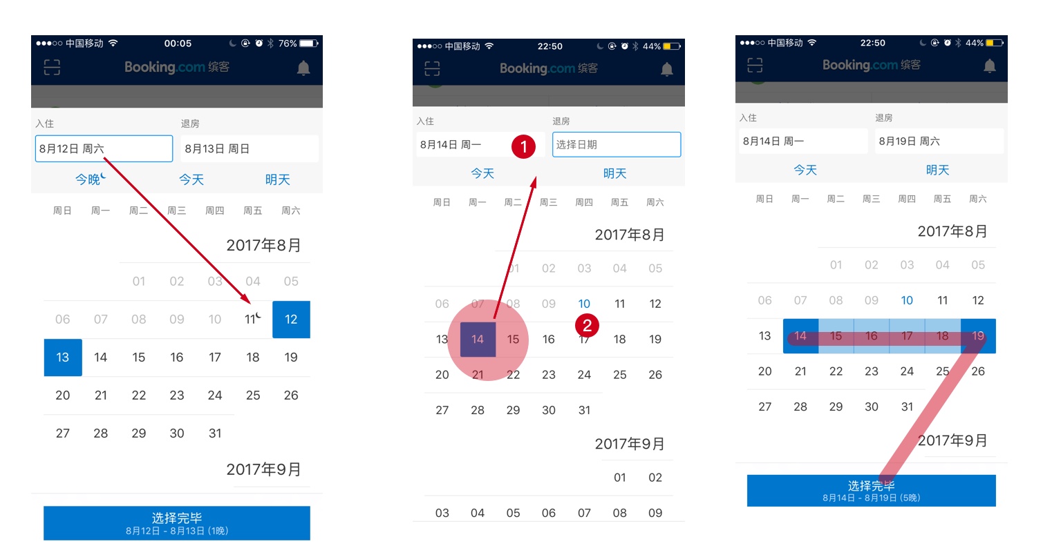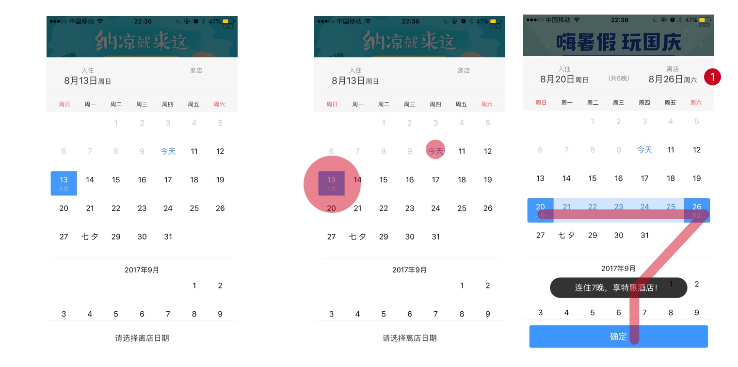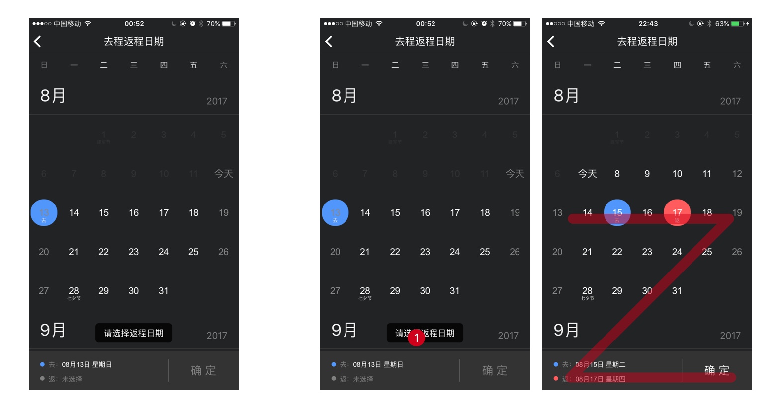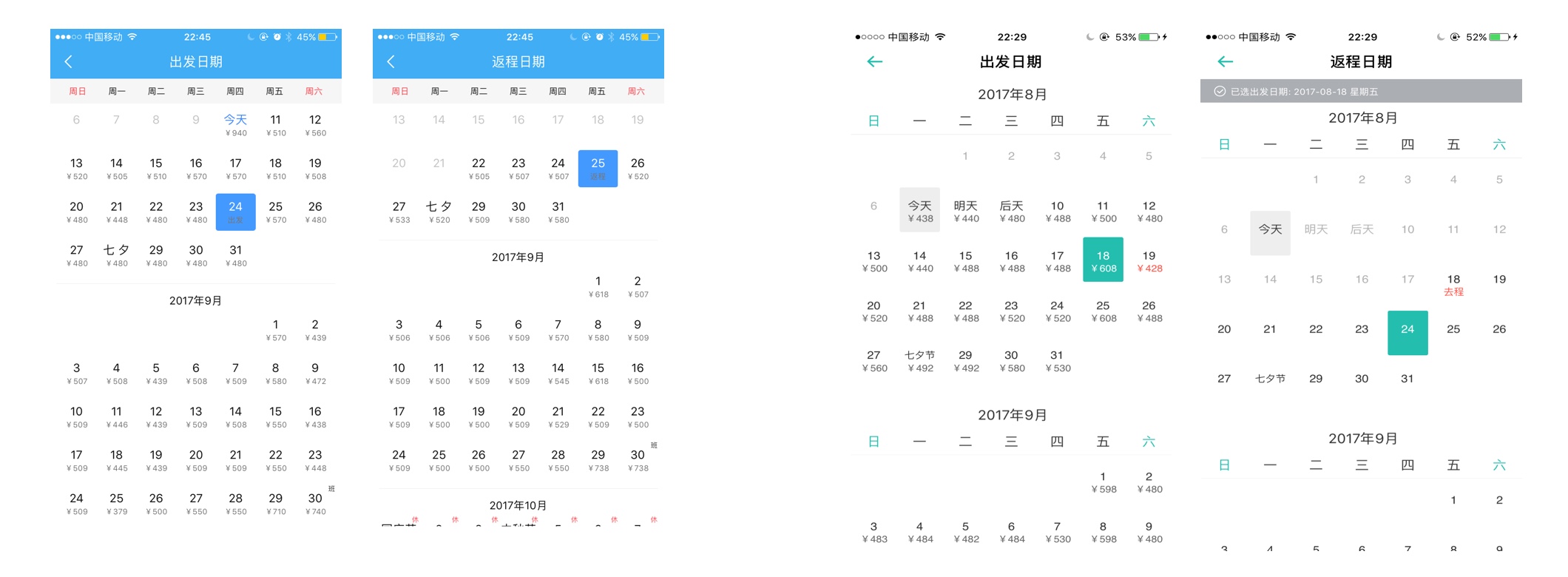 目前旅游、票務app的日期選擇器的設計一般有兩大類: