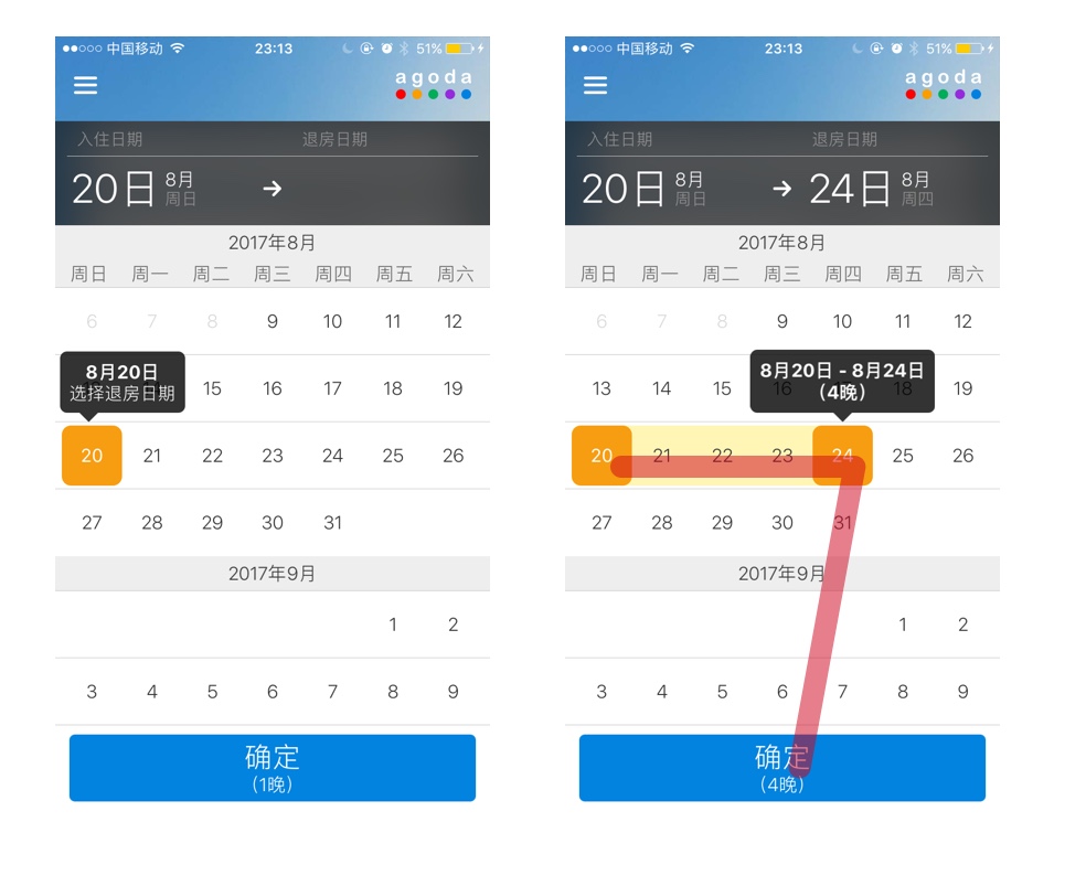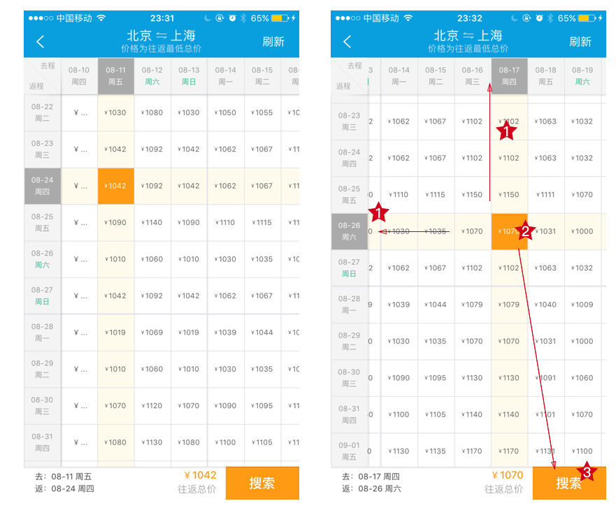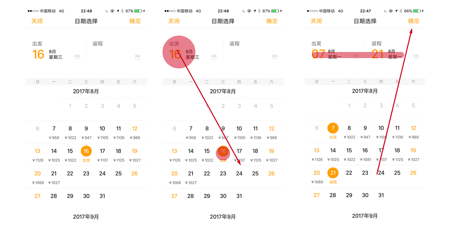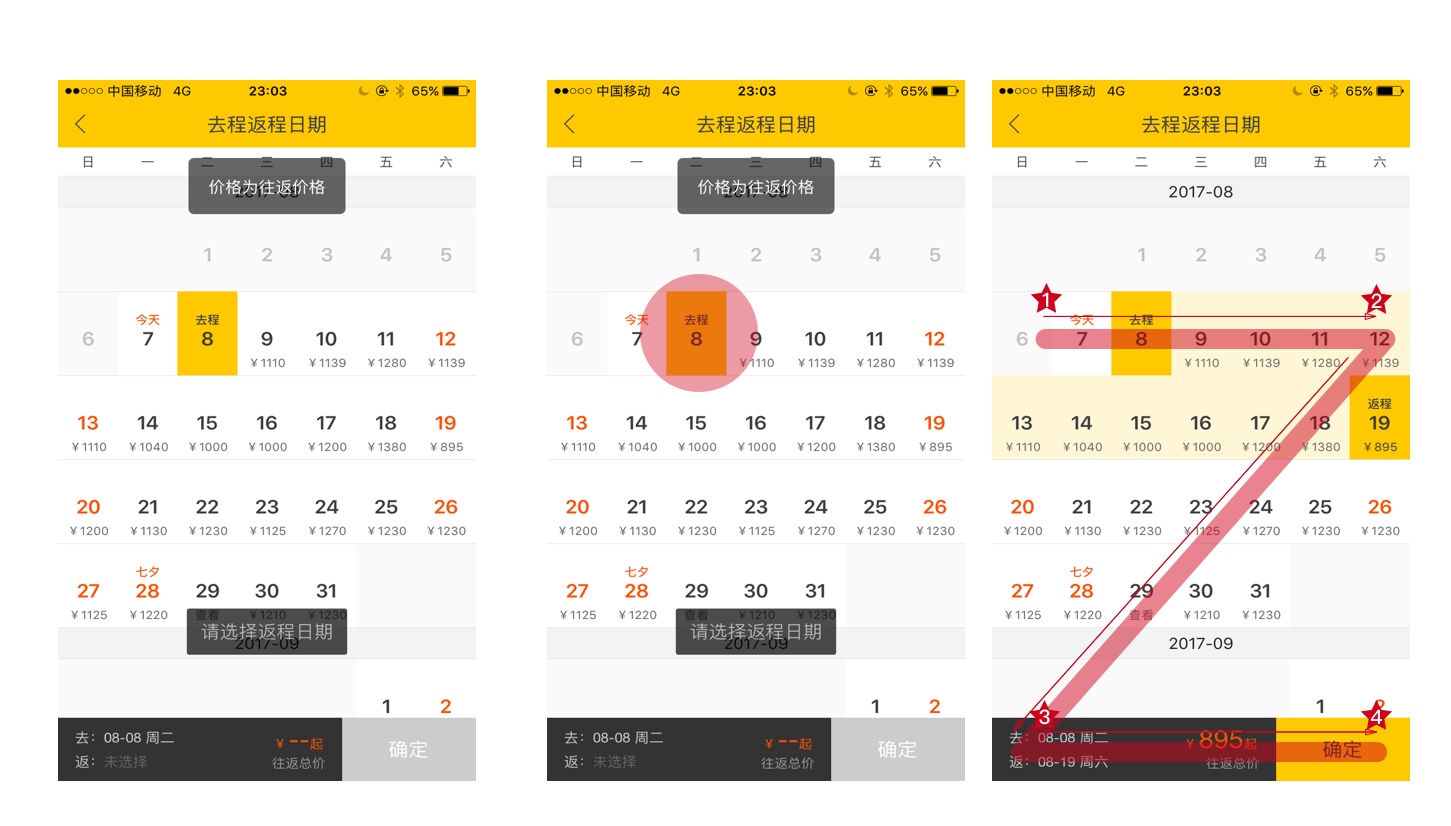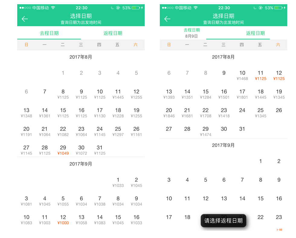左邊應用的設計讓我跳轉后很疑惑,到底我剛剛出發選了什么,沒有反饋,也不知道對不可選的定義是什么,為什么出發選了24號,跳轉到返程以后24號前的依舊可選。而在右邊的應用中則有很好的信息反饋設計。