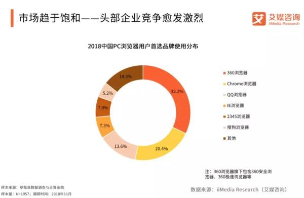 百度確實沒有必要在PC瀏覽器繼續堅持,2018年艾媒咨詢數據顯示,360瀏覽器市場份額占比32.2%居首,Chrome瀏覽器、QQ瀏覽器為20.4%、13.6%。