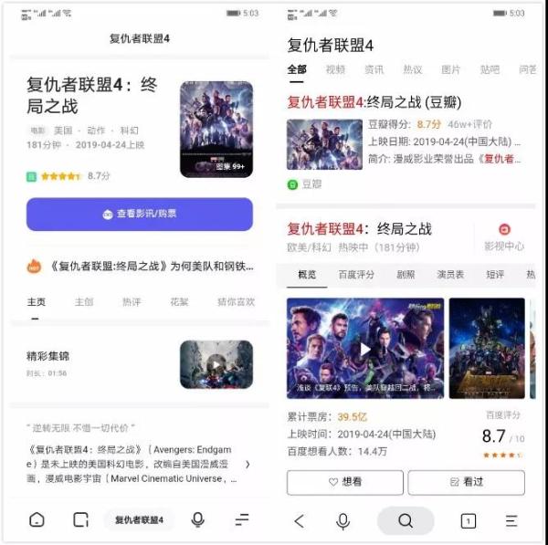 以近期爆款電影復仇者聯盟為例,當用戶進行搜索時不光可以得到百科信息,也能夠獲得豆瓣熱評,微博熱搜,購買電影票信息等全方面的服務,使其不光光成為一個搜索工具,也能夠更加簡潔的融入生活。