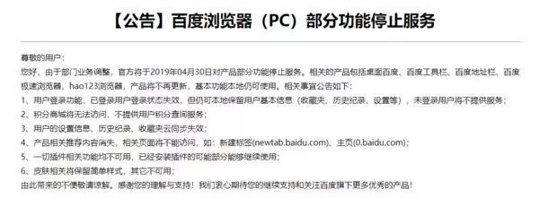 4月3日,百度瀏覽器發布PC端部分功能停止服務的公告稱,由于部門業務調整,官方將于2019年04月30日對產品部分功能停止服務。相關的產品包括桌面百度、百度工具欄、百度地址欄、百度極速瀏覽器,hao123瀏覽器,產品將不再更新,基本功能本地仍可使用。