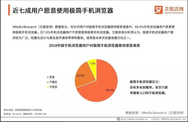 從數據中看,當用戶對信息流產品產生審美疲勞時,去廣告化與人工智能結合的產品可能會被用戶認可,通過數據顯示可以得知,69.5%的用戶愿意使用極簡手機瀏覽器。當首頁只提供搜索入口的手機瀏覽器變得愈發重要時,瀏覽器也就會迎來新的變革。