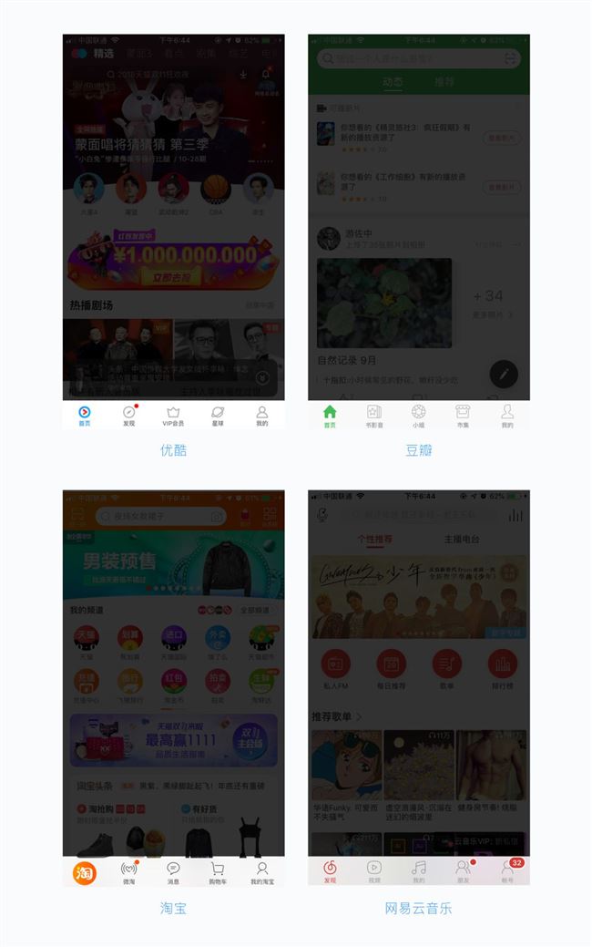 底部導航欄設計是我們最常見的導航模式之一,位于頁面底部,用于一級頁面當中負責各主業務模塊的切換,一般會保持3~ 5 個標簽,適用于頻繁切換業務模塊的產品。例如優酷、豆瓣、淘寶、網易云音樂: