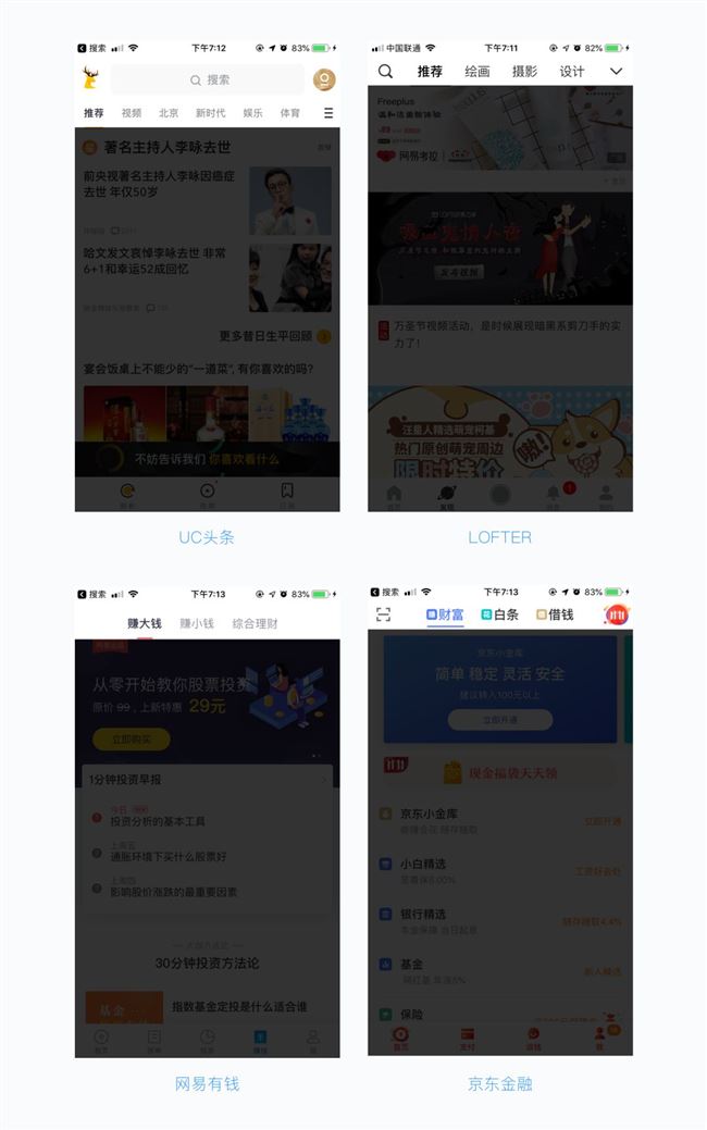 頂部導航欄位于頁面頂部,一般位于導航欄或者狀態欄下方,用作于二級導航,基本都以純文字的形式出現(避免干擾用戶瀏覽頁面核心內容),常見的頂部導航欄有:固定頂部標簽導航&可滑動標簽導航。例如uc頭條、lofter、網易有錢、京東金融: