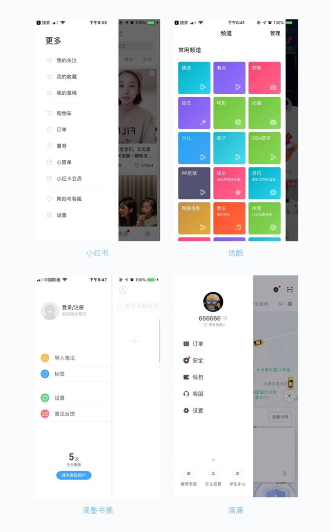 側邊欄導航是除了核心功能意外的主要功能全部隱藏在側邊欄里,一般通過點擊左上角的 icon 彈出,左側區域現實導航中的內容。例如小紅書、優酷、滴墨書摘、滴滴: