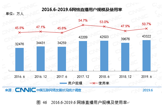 根據(jù)CNNIC調(diào)查報(bào)告顯示,截至2019年6月,我國(guó)網(wǎng)絡(luò)直播用戶規(guī)模達(dá)4.33億,占網(wǎng)民整體的50.7%,較2018年底增長(zhǎng)僅為3646萬(wàn)。而2018年,我國(guó)網(wǎng)絡(luò)直播用戶規(guī)模達(dá)3.97億,較2017年底減少2533萬(wàn),用戶使用率為47.9%,較2017年底下降6.8%。