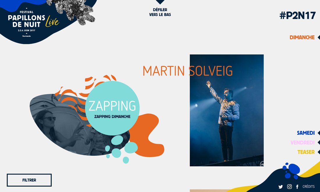Papillons de Nuit festival 這個(gè)活動(dòng)主題網(wǎng)站就很好地借助波紋和曲線來(lái)強(qiáng)調(diào)。網(wǎng)頁(yè)中,基于波紋和曲線所構(gòu)成的元素各司其職,左上角的波紋元素帶有動(dòng)效,你不會(huì)忽略其中所承載的主題,中間多重波紋構(gòu)成的Zapping 元素和矩形的 Martin Solveig 圖片構(gòu)成對(duì)比,組成了視覺主體,而右下角流動(dòng)的波紋則承載著用戶可能感興趣的社交媒體鏈接。