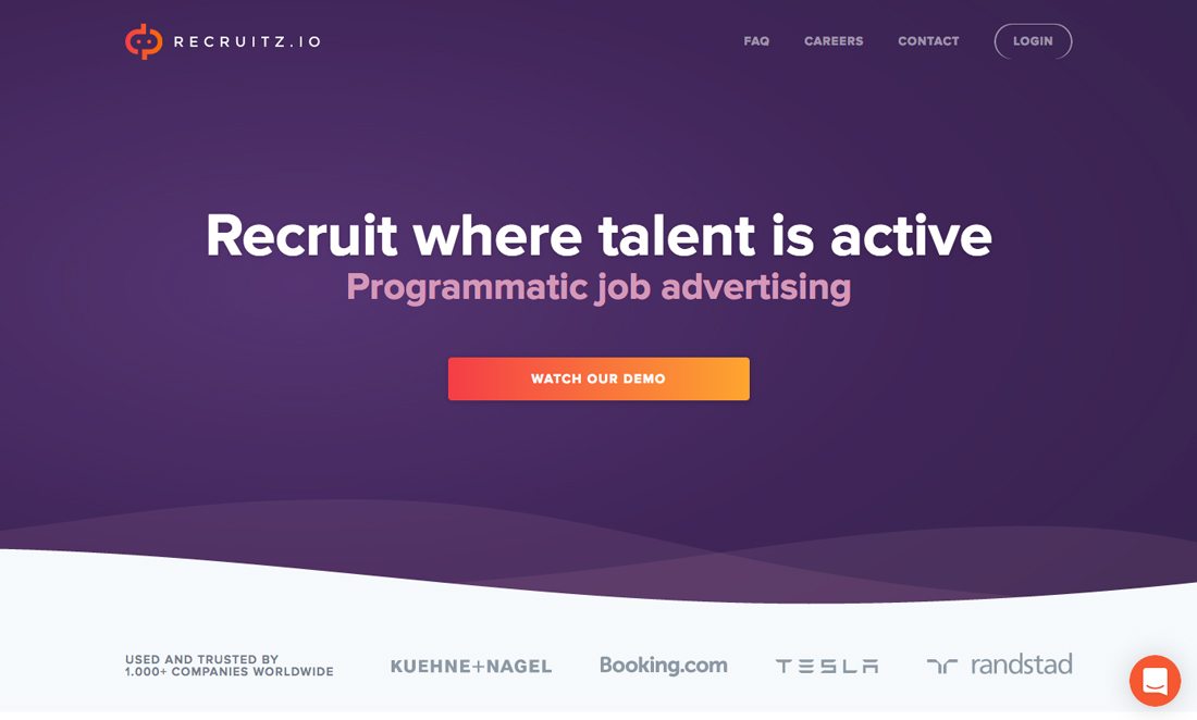 Recruitz 這個(gè)網(wǎng)站就將首屏頂部紫色背景的下邊緣設(shè)計(jì)成為波紋曲線,這種非規(guī)則的視覺元素會(huì)讓用戶不自覺地注意到,而又不具備侵略性。多層波紋曲線讓背景擁有了層次,用戶視線自然下探過(guò)程中,會(huì)不自覺地被漸變橙色的CTA按鈕吸引。當(dāng)然,色彩的選取也起到了一定程度的作用,但是波紋曲線也功不可沒(méi)。