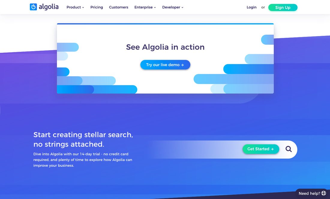 如果將波紋曲線和漸變的技巧結(jié)合起來(lái),運(yùn)用在Material Design 風(fēng)格的頁(yè)面背景當(dāng)中,就像 Algolia 這樣設(shè)計(jì),一樣能夠創(chuàng)造出協(xié)調(diào)但是有趣的設(shè)計(jì)。