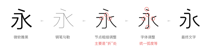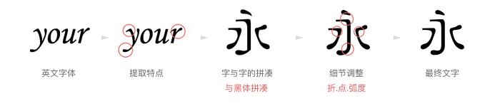 要記住,你所提取的是筆畫的特點,它用在哪是由你來定,不需要和原本英文字體筆畫位置相同。(這里的實戰演習丟了,大家就看看“永”字吧)