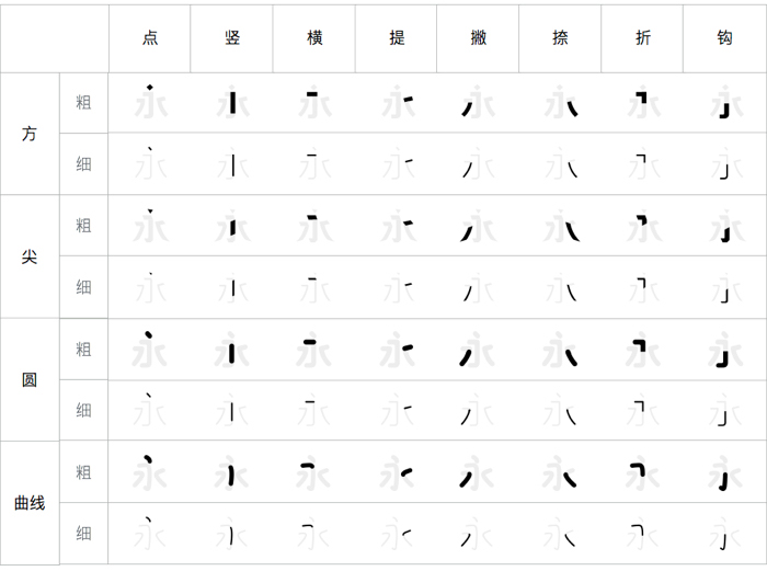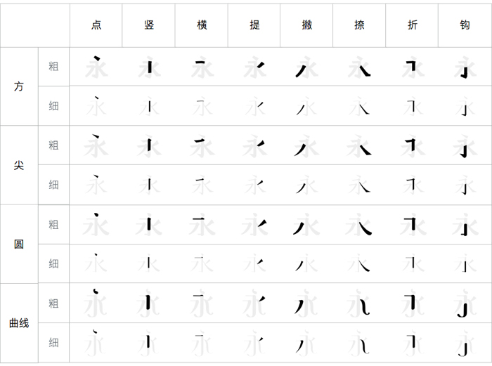 為了更好展示似黑體變體字的基本筆畫和筆畫形狀,將其小類轉化為表格,并都以“永”字來示意;此處示意的“永”字都是由最常規的筆畫形狀拼湊而來,另外在筆畫形狀的子類目里增加了“粗細”維度,因為字體的“粗細”會直觀影響人們對字體的感覺和認識。