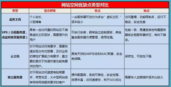 空間主要分為虛擬主機、VPS、云主機、獨立服務器四大類型,各有其優缺點,如下圖所示: