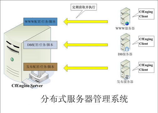 在分布式服務器辦理體系軟件中有一些比較優異的軟件,其中比較抱負的一個是 Cfengine。它能夠對服務器進行分組,不同的分組能夠別離定制體系裝備文件、計劃任務等裝備。它是根據C/S 結構的,一切的服務器裝備和辦理腳本程序都保存在Cfengine Server上,而被辦理的服務器運轉著 Cfengine Client 程序,Cfengine Client經過SSL加密的連接定期的向服務器端發送懇求以獲取最新的裝備文件和辦理命令、腳本程序、補丁裝置等任務。