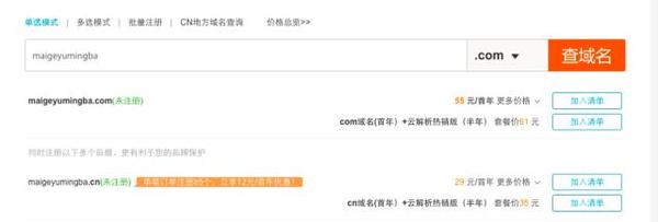 我們?cè)?a target="_blank">注冊(cè)域名的時(shí)候,只能注冊(cè)“主體.后綴”的形式的域名,前面的www或其他內(nèi)容在我們注冊(cè)成功后可以自行在域名解析后臺(tái)進(jìn)行設(shè)置。下圖是購(gòu)買域名的示例圖。