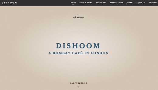深色的米色(如 Dishoom 網站上)將創造一種土質和幾乎紙狀的紋理,而較淺的色調感覺更新鮮。在這種情況下,圍繞品牌名稱的較淺的陰影,向外變暗,幫助給餐廳創造一種取自大地精華的新鮮食材的感覺。