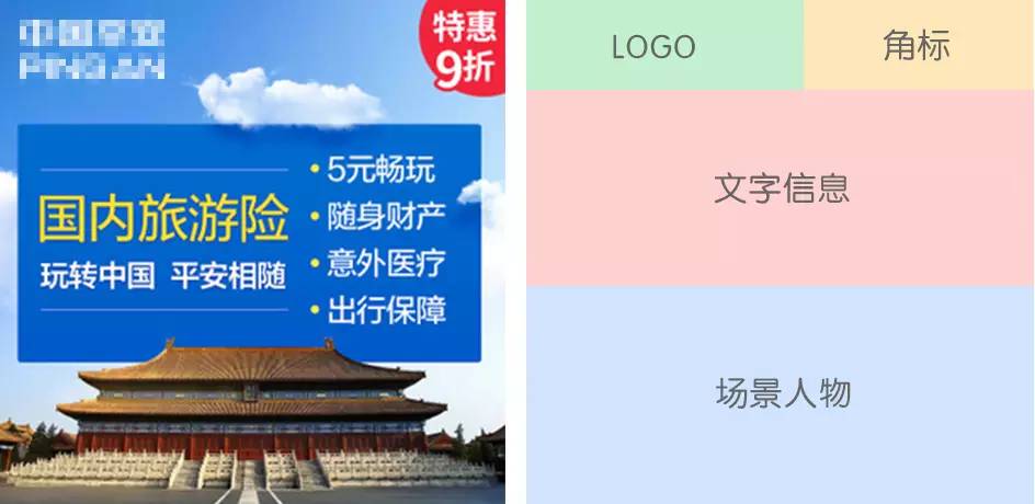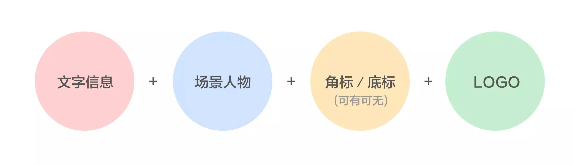 主要由文字說明信息、烘托氣氛的場景和人物圖片、運營性質的角標和底標(可選)、公司logo,這四個主要部分組成。