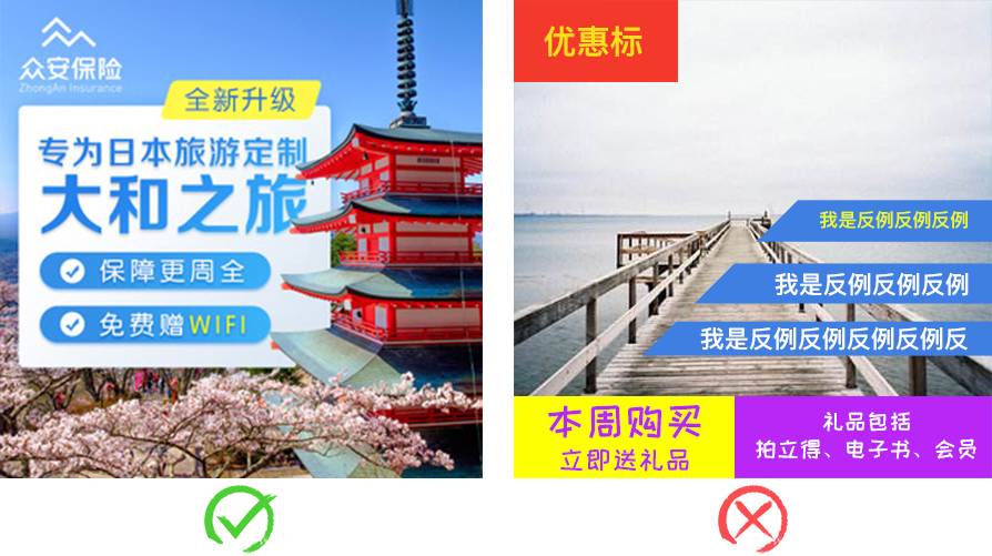 左圖文字信息顏色和配圖顏色協調、符合主題,整體感覺統一;右圖色彩過多。