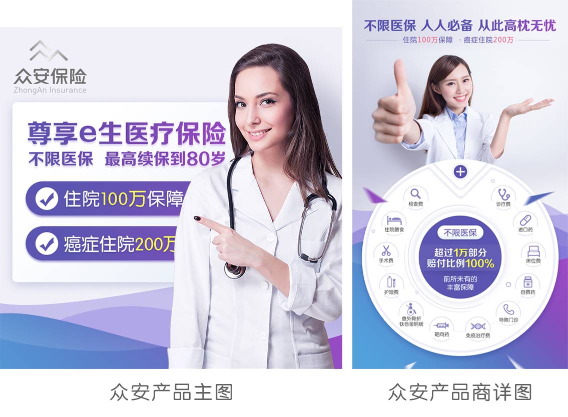 我們在天貓旗艦店現有幾十款保險產品,我們在設計這些產品圖時也充分考慮了一致性。從版式、配圖風格、字體,區別于其他保險店鋪,形成統一的眾安產品圖的style。想要在保險產品主圖同質化問題嚴重的情況下突圍,產品圖必須擁有自己的品牌個性。