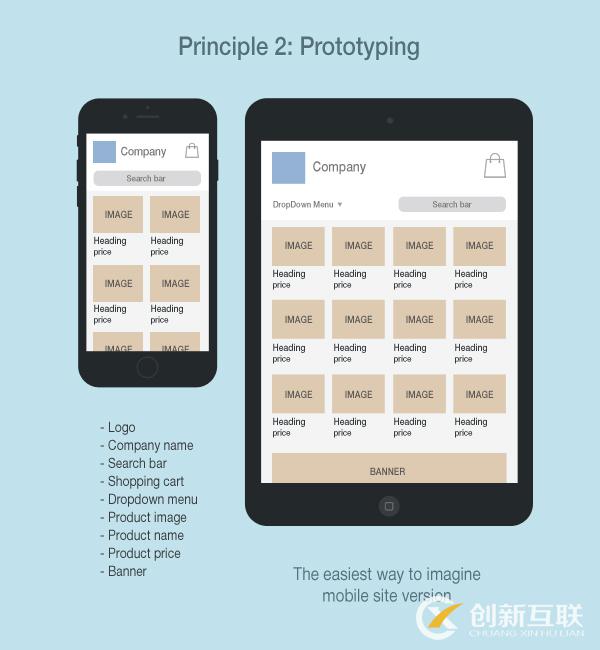 一旦你收集了公司的所有必要的信息,你可以得到它的移動網站的設計。最好是從一個原型開始,這大大簡化了這個過程。一個原型應該包含所有頁面結構元素:文本塊,圖像,鏈接,按鈕,標題和字幕,你可以用如PS圖象處理軟件或Axure,創建不同的原型在紙上。