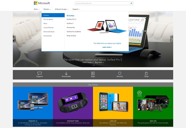 以微軟的首頁(yè)為例,網(wǎng)站的導(dǎo)航欄被劃分成四個(gè)項(xiàng)目,考慮到微軟龐大的產(chǎn)品線,這幾乎已經(jīng)被簡(jiǎn)化到了極致。也正是因此,每個(gè)項(xiàng)目的下拉菜單都被巧妙地分割成為幾段,這樣一來(lái),導(dǎo)航的層級(jí)就清晰了,用戶可以更快地找到他們想要的東西,而微軟也可以將復(fù)雜多樣的產(chǎn)品和服務(wù),整合到一個(gè)看似簡(jiǎn)單的導(dǎo)航欄里面。