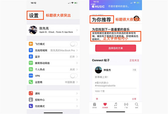 蘋果手機中自帶的軟件(iOS11設計規范):在新版本的蘋果手機自帶的軟件中標題都屬于字體放大,界面簡潔的設計風格。還有蘋果自帶的音樂軟件中,段落中的標題和正文區別是很明顯的,標題明顯很大,而正文部分相對較小,這就是優美簡約原則的體現,如下圖: