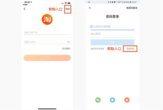 例如淘寶APP和知乎APP登錄頁面的幫助入口:在比較重要的功能入口處有必要提供相應的幫助入口,來解決用戶在操作功能過程中遇到的問題或者反饋問題的入口,不要讓用戶在出現問題時手足無措,不知道怎么辦,具體看下圖:
