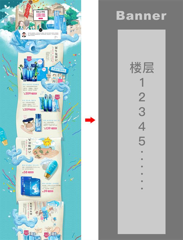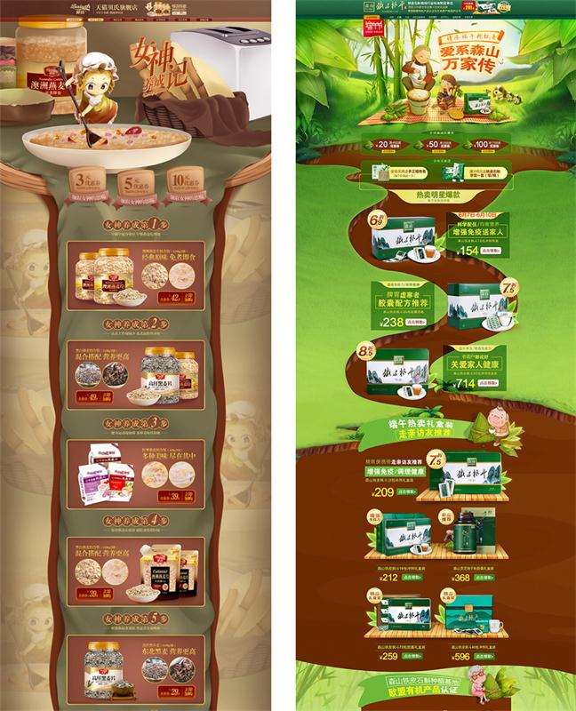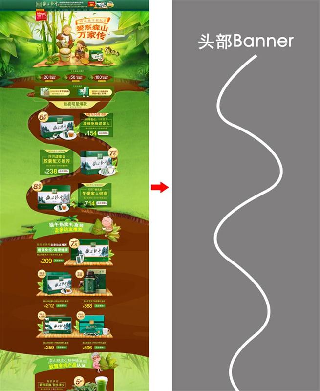 但對于手繪的頁面來說,以下這些設計方式及特點是只有它才擁有的,比如借助手繪搭建一個場景,場景里有小路/小溪/或藤蔓等剛好化作樓層來放置商品,使得頭部Banner與樓層部分融為一體,整體看起來非常流暢: