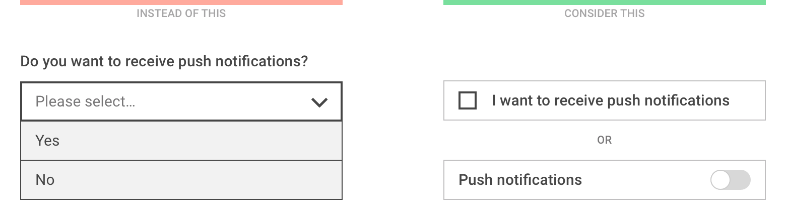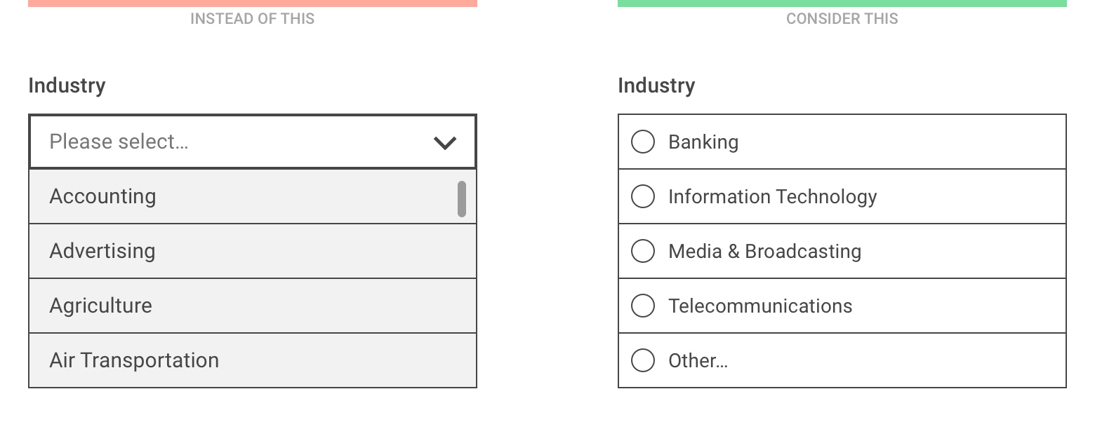從下拉列表中選擇一個選項(特別是移動設備)是一個多步驟的過程:你必須點擊下拉菜單打開選項列表,然后滾動并掃描以選擇一個項目,然后關閉下拉列表。