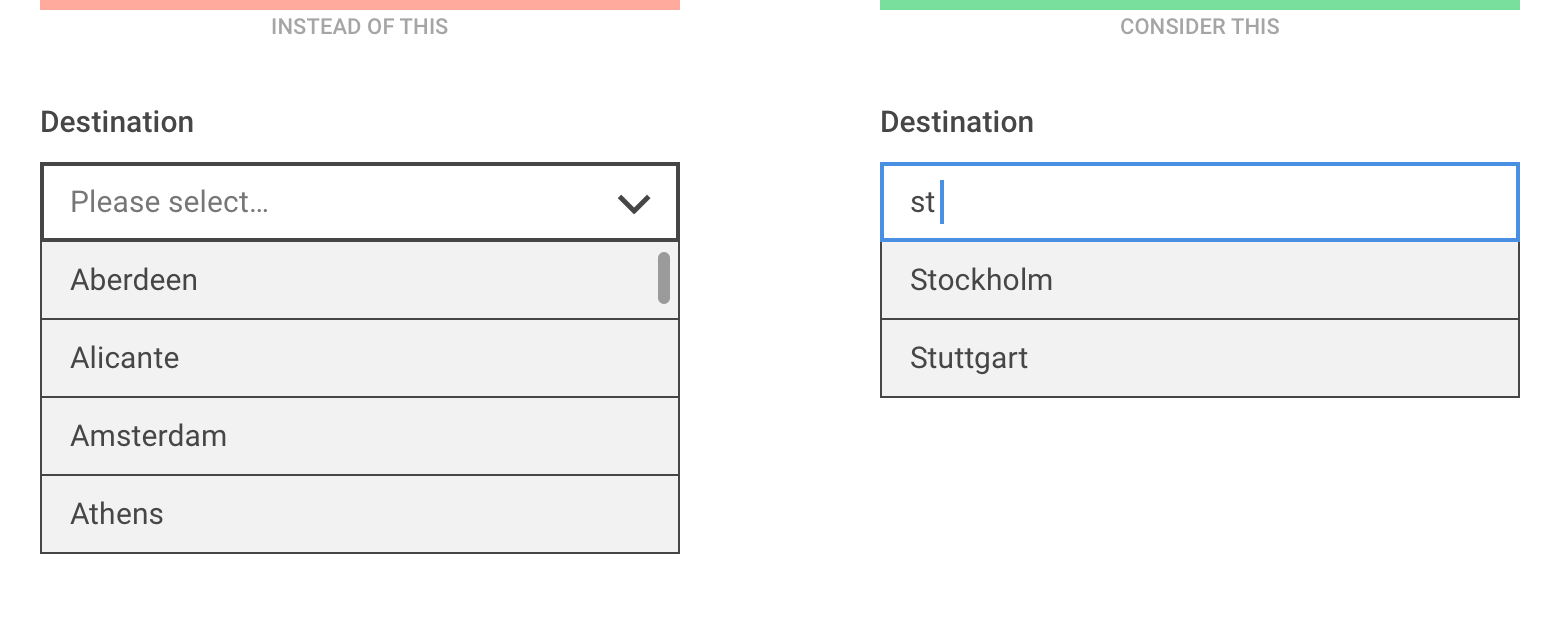 下拉列表的優點之一是用戶不用過多多輸入。但如果預期的輸入不是太長,并且經常被詢問(例如個人數據),則通常更容易鍵入,而不是從列表中選擇它: