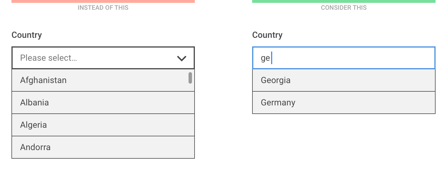 更長的下拉列表,例如國家/地區選擇器可能是一個惡夢掃描,尤其是在通常無法進行鍵盤搜索的手機上。