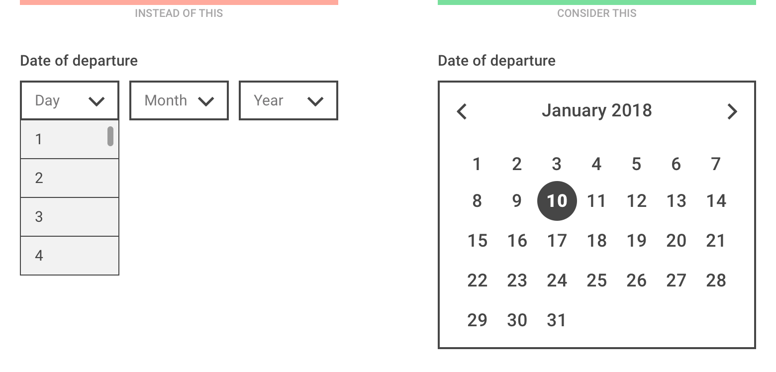 選擇多個選擇菜單的日期可能是一個不堪的體驗,所以進入就近的日期,總是使用日期選擇器。(但不要用它來輸入出生日期!)