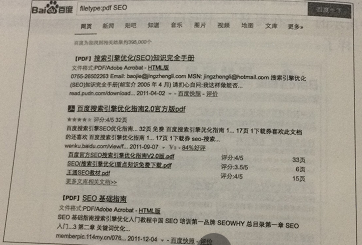 百度只支持以下幾種文件格式:PDF,DOC,XLS,PPT,RTF,ALL.其中的“all“表示所有百度支持的所有類型,google則支持所有能索引的文件格式,包括html,php等。Filetype:指令用來搜索特定的資源,比如PDF電子書,WORD文件等非常有用。