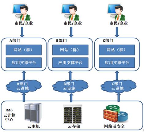 政府網(wǎng)站基礎(chǔ)設(shè)施集約化的形式之一是數(shù)據(jù)中心,在很多政府機(jī)構(gòu)已經(jīng)普及,且技術(shù)成熟、成功案例豐富,已經(jīng)步入成熟階段。而云計(jì)算中心(政務(wù)云)尚是新生事物,在國(guó)家大力扶持下,已在幾十個(gè)地市、區(qū)縣進(jìn)行試點(diǎn),取得可喜成果,已適合在全國(guó)大面積推廣?;A(chǔ)設(shè)施集約化的建設(shè)思路如下: