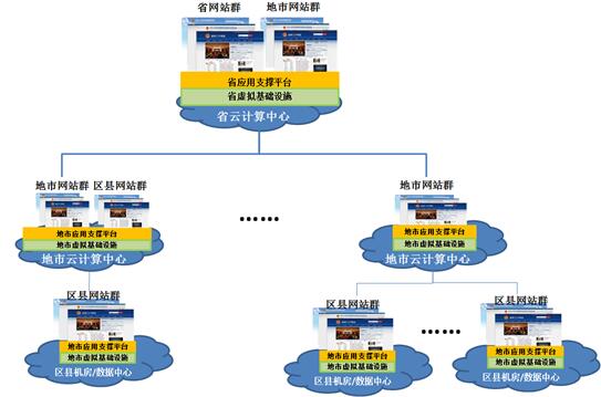 地方政府的應(yīng)用支撐平臺(tái)集約化可分為省級(jí)、地市級(jí)和區(qū)縣級(jí)三級(jí)集約方式。省級(jí)政府網(wǎng)站應(yīng)用支撐平臺(tái)集約化可基于省云計(jì)算中心進(jìn)行建設(shè),省級(jí)政府網(wǎng)站群、地市級(jí)政府網(wǎng)站群均在此平臺(tái)上進(jìn)行建設(shè)、維護(hù)和運(yùn)營(yíng)。地市級(jí)平臺(tái)和縣級(jí)平臺(tái)以此類(lèi)推。在做地方集約化平臺(tái)時(shí),應(yīng)滿足上級(jí)對(duì)下級(jí)平臺(tái)的日常監(jiān)管需要。