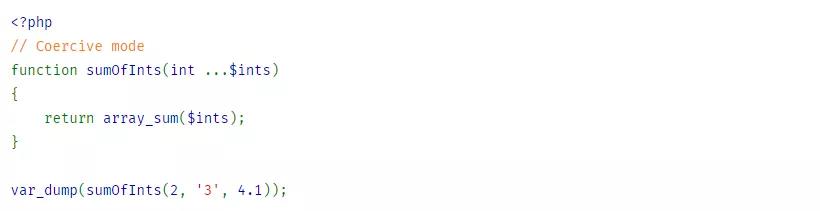 標量類型聲明 有兩種模式: 強制 (默認) 和 嚴格模式。 現在可以使用下列類型參數(無論用強制模式還是嚴格模式): 字符串(string), 整數 (int), 浮點數 (float), 以及布爾值 (bool)。它們擴充了PHP5中引入的其他類型:類名,接口,數組和 回調類型。