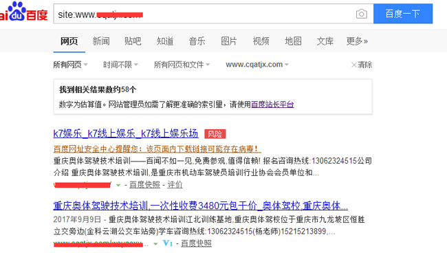 1)、 搜索原站的相關(guān)關(guān)鍵詞,它的標(biāo)題與網(wǎng)址,在搜索結(jié)果中被替換成黑客推廣的站點(diǎn)信息,但原站的排名會(huì)持續(xù)保持一定時(shí)間。