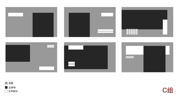 為了展現(xiàn)“圖片突出”的優(yōu)秀設計作品里,文字部分與這兩個基本要素的位置關系,同樣做成效果圖。分C、D兩組展示。