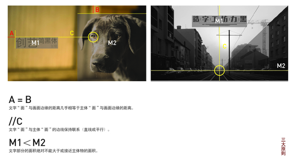 上圖是說明我并不憑感覺去確定文字部分的位置,僅僅只是按照三大原則來確定的。在左圖中,小狗雖然是照片里的主體物,但是因為眼睛的存在,所以文字的排版必須依照視覺焦點(眼睛)來排版,這是之前D組結論提到過的。但是在計算字體部分與畫面邊緣的距離的時候,依然參照與主體物與邊緣的距離,而非視覺焦點與邊緣的。
