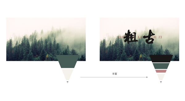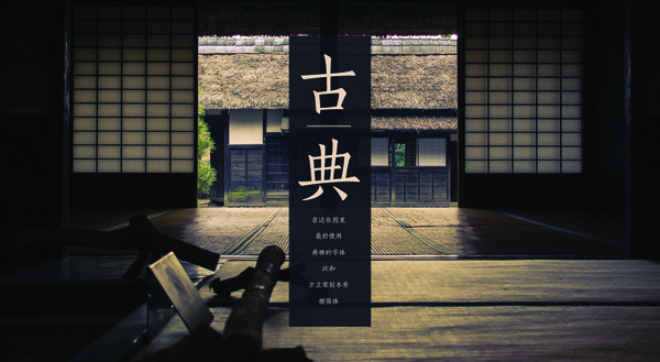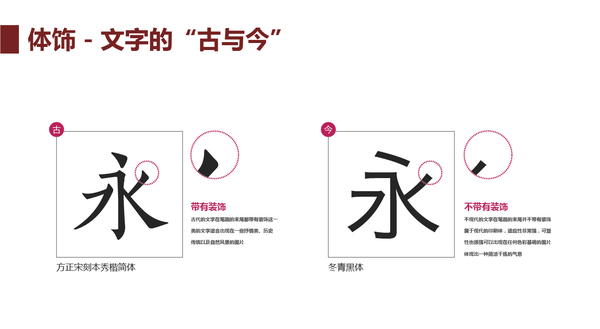 體飾指的是在字體筆畫末端的裝飾,字體的體飾之間不是有或無,而是多和少,這是一個比較模糊的概念。通常按照筆畫體飾的多少劃分“古”文字和“今”文字。“古”文字適合作為標題,出現(xiàn)表現(xiàn)自然、傳統(tǒng)或者表現(xiàn)歷史厚重感的題材里,“今”文字大多是在時尚、科技或者普通生活題材里,“古”文字最重要的特點是抒情,“今”文字則注重簡潔。