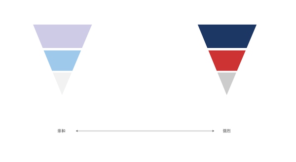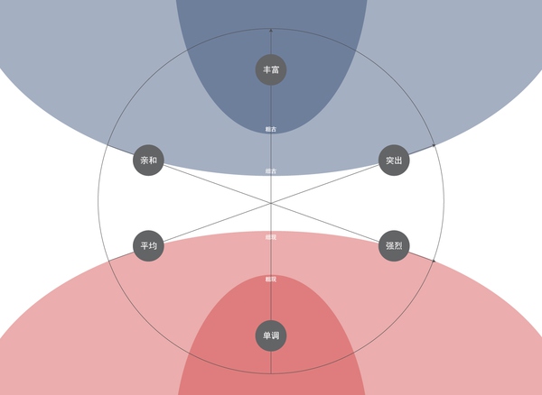 于是我總結這些文章的觀點,我重新設計了一個色彩的組合模型,用來描述多個色彩組合的視覺心理效果,見下圖: