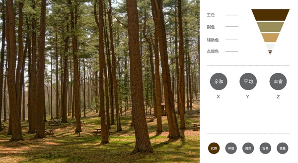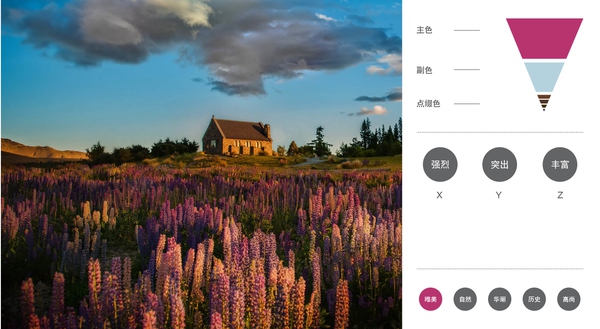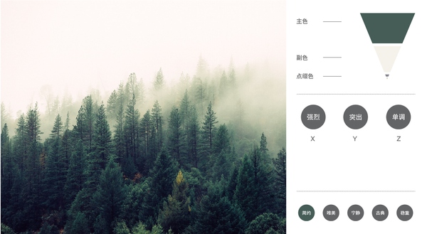而在網(wǎng)上大部分的配色教程里,則用“色卡”來解釋色組的視覺心理的,“色卡”是從一張照片里提煉出三到六個主要色彩組合起來的配色方案,并認為“色卡”和原照片的視覺心理效果(情緒)是相同的,因此大部分設計作品會以此為參照做網(wǎng)頁設計配色方案。