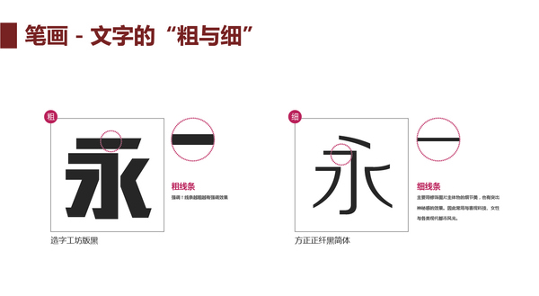 筆畫的差異在于粗細,粗筆畫用于強調(diào),細筆畫則用于修飾細節(jié),例如突出某商品的精細做工。這里還有特別說明的一種情況是粗細結合,筆畫的粗細差異算其實是屬于體飾的變化。
