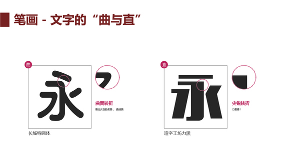 轉折的差異在于曲直,轉折越尖銳的字體適合表達力量感,反之曲面轉折的字體適合表現(xiàn)女性的柔美。見下面兩個例子