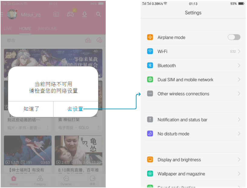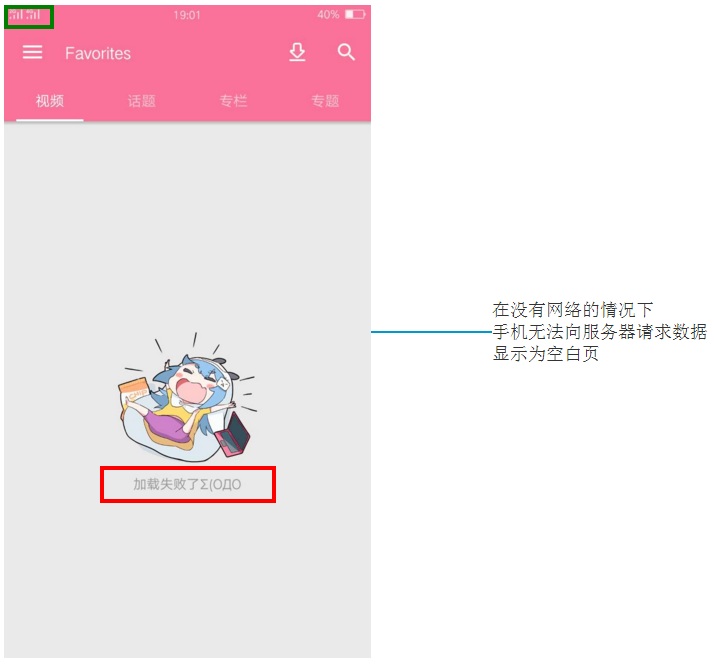 手機處于網絡信號不好或者沒網的時候,比如說在地下室或者飛機上,網絡信號沒有,這時候用戶點進去某一個模塊,還是以B站舉例子,在我沒有聯網的情況下,進行刷新的操作,手機因為沒有網絡環境差,無法向服務器請求數據,“手機 -> 服務器”的鏈路出現問題,也會出現空白頁的情況。