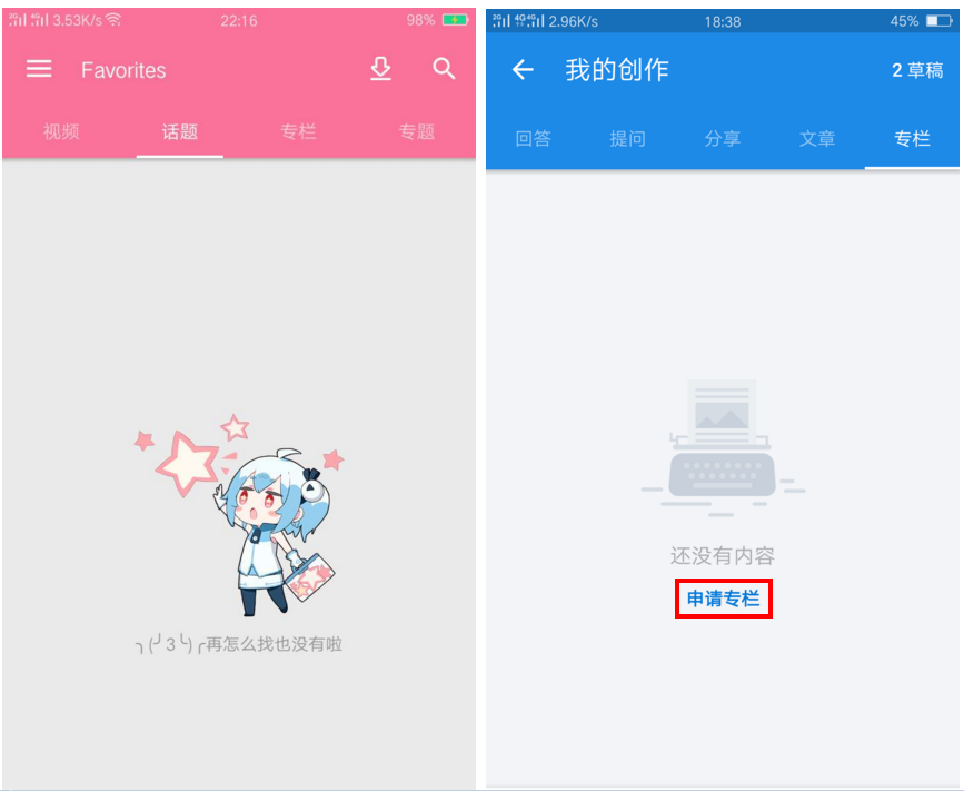 另一種方式是引導用戶的行為,如上圖右展示,在知乎的個人中心 – 我的創作- 專欄頁面,我目前還沒有申請專欄,所以會產生空白頁,產生原因是null,知乎也和B站一樣,給了文案提示:還沒有內容;同時給了一個申請專欄的入口,去引導用戶的操作。引導用戶這樣的解決方案可能是通過用戶反饋一步一步迭代出來的,用戶在瀏覽到專欄這一步的時候,有申請專欄的訴求,知乎的產品同學于是乎就在文案提示的基礎之上,設計了這樣的一個申請入口。