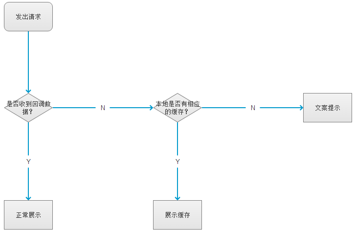 當從服務器請求失敗的時候,無論是“手機 -> 服務器”鏈路出現問題,還是“服務器 -> 手機”鏈路出現問題,都會首先訪問緩存,看看緩存有沒有該數據的緩存,若是有,展示緩存,若沒有,則展示相應的文案提示。