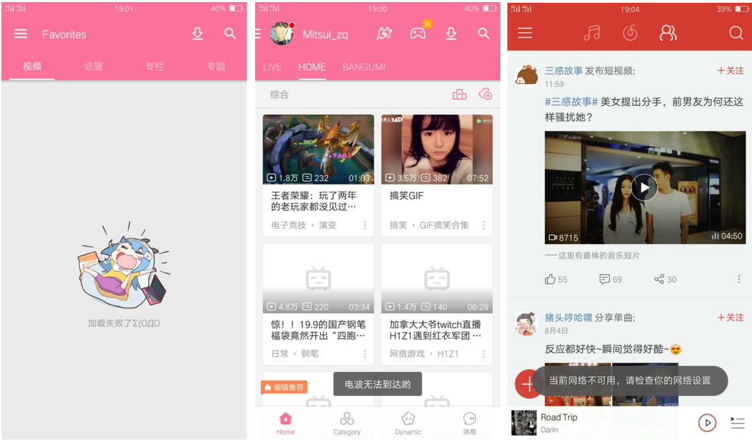 文案提示的解決方案,最重要的就是內容的呈現,要能通過文字或者圖形,明確地告知用戶是什么原因才產生了空白頁;其次就是文案及圖形的特色,對比知乎和B站兩個風格截然不同的app,他們的文案及圖形都遵循了自己app的特色,知乎是知識分享的平臺,走嚴謹風;B站充斥著00后、95后、彈幕,走的是二次元的風格。
