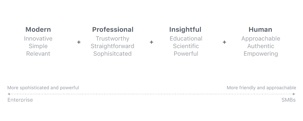 我不知道最終這個設計系統會是什么樣子,但是我清楚它一定不能太精確,不能限制得過死。它需要是可擴展的,靈活的,并且擁有優秀的成長性和可進化性。在真正開始視覺設計之前,我希望知道我們對于產品和用戶之間的交互有怎么樣的預期。我們想到了一系列不同的語匯來對其進行描述,比如人性化、專業、值得信賴、友善等。