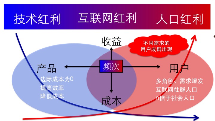 任何商業模式,或者社會價值,都有一個紅利基礎。我們在講互聯網紅利的時候,我們分兩部分:技術的紅利跟人口紅利。技術的紅利表現為成本越來越低,人口紅利表現為人的需求爆發。