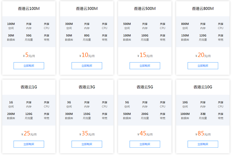如上圖所示,創新互聯騰訊云主機空間總共有8款不同配置的香港虛擬主機,各個套餐對應的主機空間和價格都不一樣。其中最便宜的是香港云100M,網頁空間有100MB,單價5元/月(續費也同價)。不過針對企業網站建設實用的應該是香港云500M,空間500m容量足夠一個企業網站存儲資料了,數據庫100m其本也夠用了,具體選購騰訊云香港空間那一款還得看你的自身需求來定。